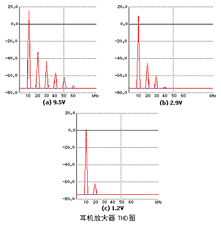 图9显示出THD(失真)在9.5V、2.9V和1.2V情况下的衰减情况。太完美了!它们显现出线形的谐波衰减(功率越小失真就越低)。