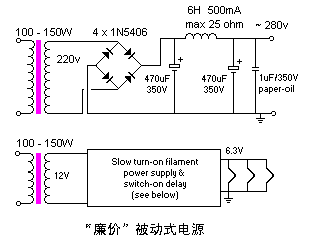 9/17/98:改进图4稳压电源:用MOSFET/BJT达林顿管代替单只MOSFET,更好地控制大容量电解的涌动电流。改进图4和图5:灯丝接地,断开图3的“E”点。增加电源的“廉价”版本(图6)。