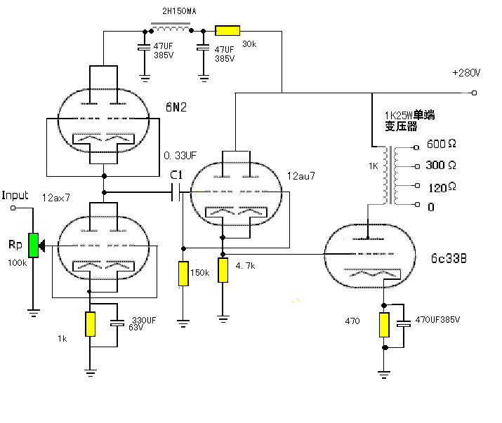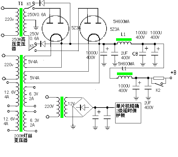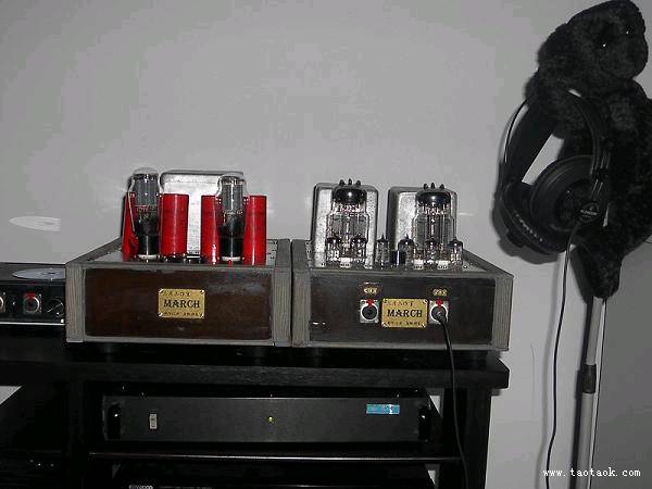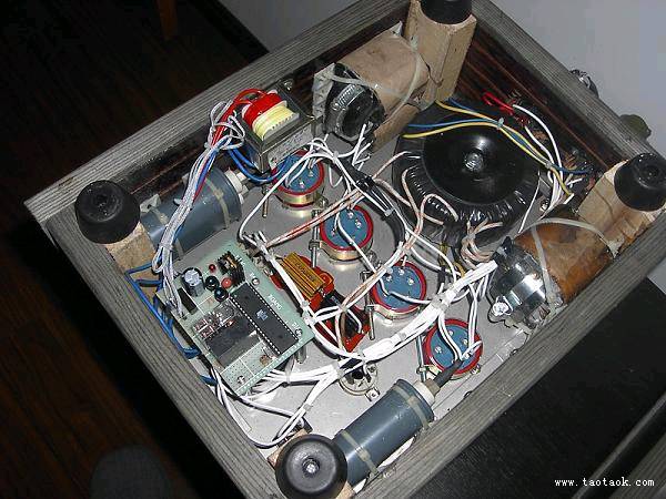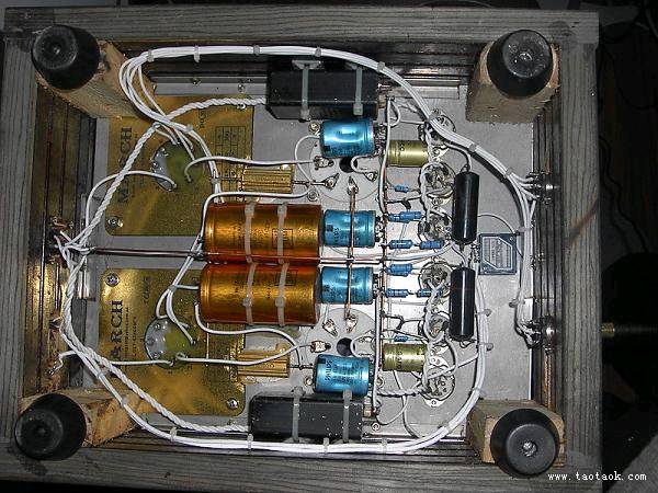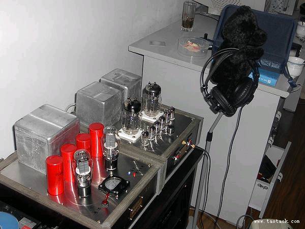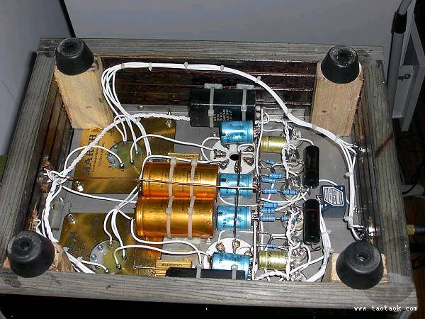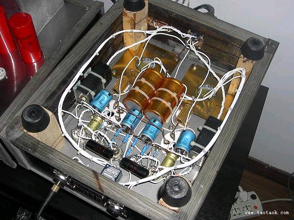 现在终于闲下来了,我来把这台耳放的制作过程向大家汇报下。要说这台机子就要从2个月前说起,当时我的6P14的耳放完工了,我请武汉的耳机玩家来我家听我的耳放,他们听后都感觉很满意,其中就有位朋友说他也准备做个胆耳放,用6C33做我听后就说6C33做功放声音不错功率也大,做耳放我没有做过怕声音发硬不好听(功放推耳机声音都有发硬的毛病)。当时我正准备做2A3的耳放,我说等我2A3好了你听听在决定肯定比你的6C33好听。他说不要紧万一声音推耳机不好,就把他改功放。后来他坚持还是要做我也就答应了在场的朋友都说我们俩病得不轻。 6C33决定做以后我和他就开始准备材料,各种管子和电容我这都还有很多,现在就是机壳的问题,我家现有的机壳是不锈钢的胆机功放的壳子,他说他喜欢木头的我也就忧闷中。。。。过了几天他就拿来了2个木头的壳子,我看了看有点四五十年代味道他说是找他们楼上在装修的师傅做的用的是紫檀木地板做的2个花了30元便宜啊。壳子有了其他的材料都有了,就开始看用什么电路。6C33的电路图我找了找,也没有找到几个。6C33的图太少了的原因,其中也没有我满意的,所以我就决定自己设计,在参考了其他的图和查了许多管子的资料,经过计算以后决定用以下电路。 电压放大用12AX7并管,6N2做恒流源,主机部分由改进的孪生三极管并联输入级和典型的阴极输出功率放大级组成。其奥妙之处有两点:一点是12ax7并联使输出阻抗减小一半,驱动能力增加一倍。瞬太更好、12ax7并联使得它频响比单管时好得多;另一点是用6N2做恒流管替代了负载电阻,由于它具有可变阻抗的特性可使动态增大、工作更加稳定。为什么使用6N2做恒流管而不也恒流二极管和其他晶体管是因为这就给人一种胆石混血的印象于是就用6N2带替。这部分保留了我以前的电路风格 经过计算有前面的电路就可以很好的推6C33了,不过我发觉以上电路输出阻抗有点高加上6C33的功率大线性大,所以推起来声音不是很好听。我就在后面加了一级12AU7并管组成的阴极跟随器,阴极跟随器有输入阻抗高,输出阻抗低的特点,还有改善音质的特点等等,加了级阴极跟随器后又出现了个小问题就是多了个偶合电容,我本人不喜欢过多的用偶合电容,因为好电容比较贵。电容多了对声音有害,所以我后面用的是直偶推6C33。电路确定了就要给电路设计个好电源,这个耳放的重点就在电源上了,一个好电源对一个好电路来说是很重要的,特别是这个电路,因为6C33的耳放的功率比较大万一电源不好,就很容易产生交流声,还有就是声音发粗等等问题。电源的我用的是分离电源,这样可以提高信噪比,减少电源对功放部分的干扰等等问题。电源的变压器我也是使用的分离变压器,高压是用的250W的EI型变压器灯丝是用的250W的环型变压器。整流部分我用的是胆管全波整流,因为用胆管整流的声音胆味好,声音暖听感好,我用一个胆管里的两个2级管并成一个2级管用,因为6C33的电流大。整流用的电容我用的是4个1000UF400V的意大利产的优质电容,用这4个大容量的电容是因为这4个电容装在机子上比较好看,还有电容越大电源越干净内阻低等等,不过大容量的电容也有它的坏去,经常做胆机的朋友都知道大容量的电容对胆整流管会产生很大的冲击和声音发硬(质量好的大容量电容声音是不会发硬的这个我以前试验过)现在的问题就是对胆管的冲击问题,因为大容量的电容开机须要很大的充电电流,这样胆整流管就会因为充电过大导致胆整流快速老化和打火等等问题。为了解决上面的问题我在每只胆管上加了个晶体管的整流2级管,先给电容充电10秒钟后电充满后在切换成胆整流管,这样就减缓了对胆管的冲击,起到了保护胆管的作用。本机的扼流圈原来我使用的EI型的后来我发现有人介绍说在电感量电流一样的情况下,使用C型的扼流圈比EI型的声音华丽度上有很大的提高比换好的偶合电容还来的快,我也就换了C型的试了试是比EI型的好了很多。后还为了把电源做得更好我在原有的电路上又加了级π滤波,用了2级π滤波2个C型扼流圈,这样电源更干净所以在声音放面有些原来没有出来的细节都出来了解析力在原来的基础上得到了很大的提高。(这是在本机调试中实验出来的)本电源来在每级π滤波上还并了个2UF400V的美国油罐电容,这样的好去是起到调音的作用,(油罐电容可以使你的声音变暖)在电源的末级高压输出上我加了第2级保护电路延时50秒,目的是先给灯丝通电,让功放极的管子先预热,起到了保护功放部分电子管的作用。 我在说说功放部分的调试,功放部分初看起来很复杂其实很简单,前面的小管子都是并连的。所以电路很简洁,第一级12AX7的是恒流的电流在2MA左右它的负压在1。5V左右,第2级的12AU7的电流在3。8MA左右负压在15V左右,6C33的电流在180MA左右负压在60V左右,还有就是管子全要配对这个很重要,还有就是6C33的阴极电阻要使用35W以上的大功率电阻,偶合电容我使用的是黑寡妇电容,这个电容的解析力特好,对了功放部分的2个很大的金黄色的电容是6C33的阴极电容我使用的比较大,470UF385V是因为这个电容换大后声场就变得很宽了,其他的您可以根据自己的情况来调换。本机的部线全是用的特富龙的镀银线(这个线好大家以后可以用这个线做机子)焊锡丝用的是进口含银焊锡丝,输出变压器用的是25W的单端耳放变压器,