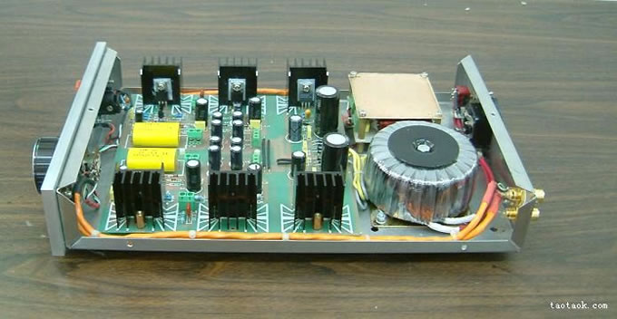 电位器本想用ALPS的,但不奈实测双声道误差达到5%,还不如手头看起来一般的台产货,因此,就用了那个台湾货~机内接线全部用一种双屏蔽的特富龙线,解析力较高,正好与功放电路特性互补。机箱左后侧安装的是保护电路,右侧电源是用的40w的环牛,电源开关后置,避免强电在机箱内的过长走线。