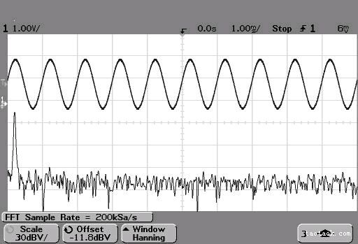 1K正弦波及频谱,在这情况下,谐波失真几近-70DB,换算失真约0.03%,当然,这是频率单纯简单的情况,实际失真要大些~