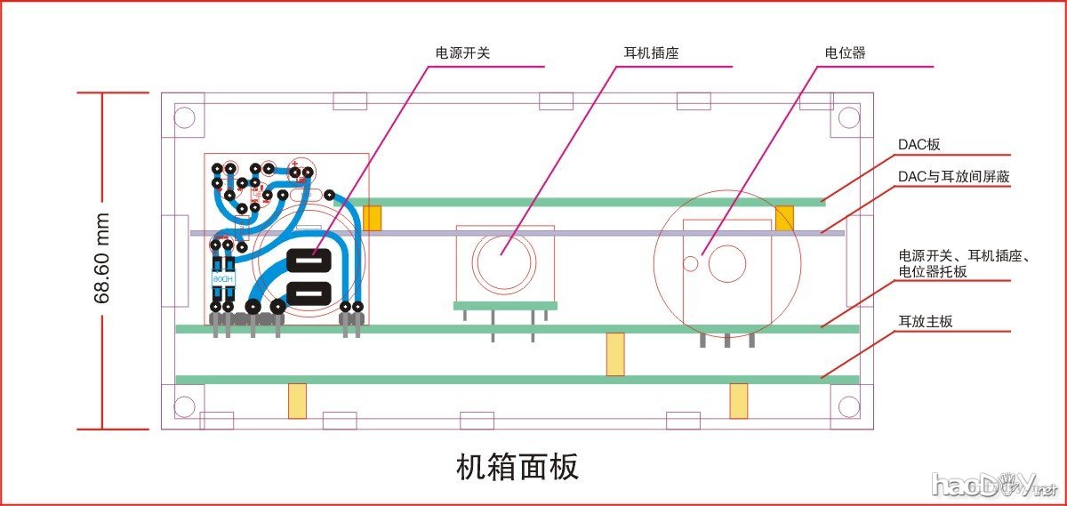 四个铜柱出来,上面一层屏蔽,打算用光驱外壳来做,屏蔽层上面是DAC板。