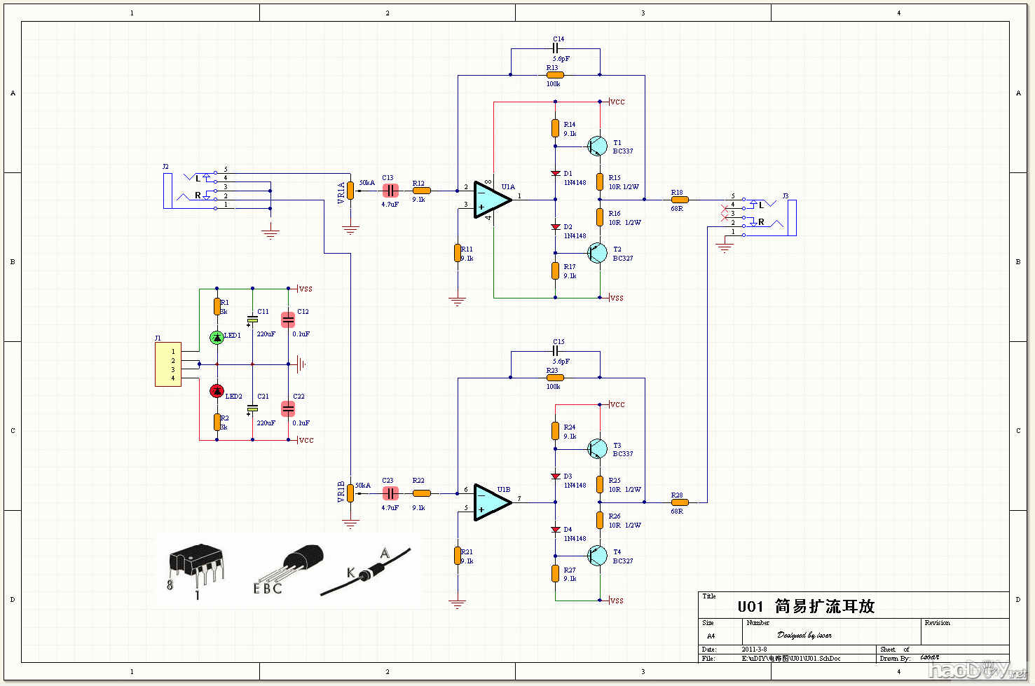 一直想做一个简单给力的耳放电路,试验过一些电路以后心中有了一些想法于是便画了这个电路。 出于简单易做的考虑,这次把lochmaster洞洞图、元件清单等一并都做了,后面会发详细设计资料供大家下载。 ![]() 【制作过程中的“面包屑”】 “给力的保证——三极管” RA1、47等运放输出的耳放差不多都研究了一遍,用运放做耳放有很多很多的好处,但是运放输出的致命伤——输出电流不足,却是一个让人纠结的心理阴影。普通的运放非短路状态下只能输出几个或者十几mA的电流,大电流运放也就只能输出60、70mA左右的电流。47耳放时用了相对较高输出的NJM4556A运放,在47的桥式并联输出结构下最大也还是只能做到100mA多些的输出电流,这个级别的电流输出能力,给高阻耳机用还凑合,给低阻耳机用就显得底气不足了。要给力电流就得有保证,所以三极管是一定要用了。 “Solo的影子” 确定了要用三极管,接下来的问题就是要确定要用什么形式的三极管电路,本着简单易做的原则所以参考Solo的输出级,但是觉得Solo还是不够简洁,那个BE间的电阻实属鸡肋,还莫不如回归经典的AB类图腾柱输出结构。于是调试了两次电阻参数后确定了现在的这种结构,最终使用发现效果还是让人很满意的。337 327的电流输出很给力,达到了这个改进的目的。 “为什么一定要用同相” 很多耳放功放都是用的同相放大电路,也就是输入输出相位相同,但是同相放大电路的中点漂移问题却比较严重,而声音相位的正反对于直接进入人耳朵的声音是没有什么区别的,所以这里使用工作点更稳定输出漂移更小的反向放大电路。 【设计制作资料】 这是全部的设计制作资料,欢迎使用,有问题或心得体会可以找我交流。QQ:781375 原理图GIF ![]() 原理图SCH ![]() Lochmaster图 ![]() ![]() ![]() Lochmaster源文件 ![]() 原件清单 ![]() 【制作过程】 以下是制作过程图片,因为前面准备充分,所以制作过程非常顺利,一上午的时间就全全搞定了。 ![]() ![]() ![]() ![]() ![]() ![]() ![]()