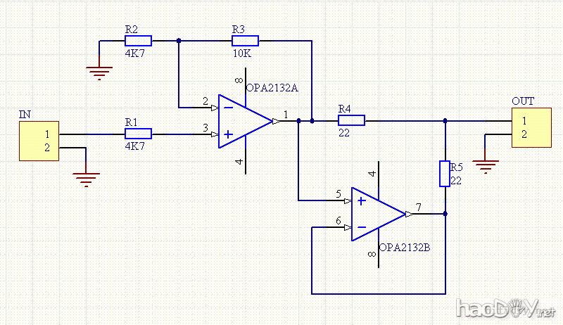 看原理图:OP并扩流,非OP叠罗汉 OP我在这里选择OPA2132,主要是因为其偏压小,输出零点稳定,而且据说是OPA2604的升级版本,值得一用。 其实应该来说,双运放都可以,实在不行就用NE5532也可暂时解渴哦。 去掉各种耦合电容,省得左选也不是,右选也不是,HI-FI对电阻的要求没这么严,容易玩。