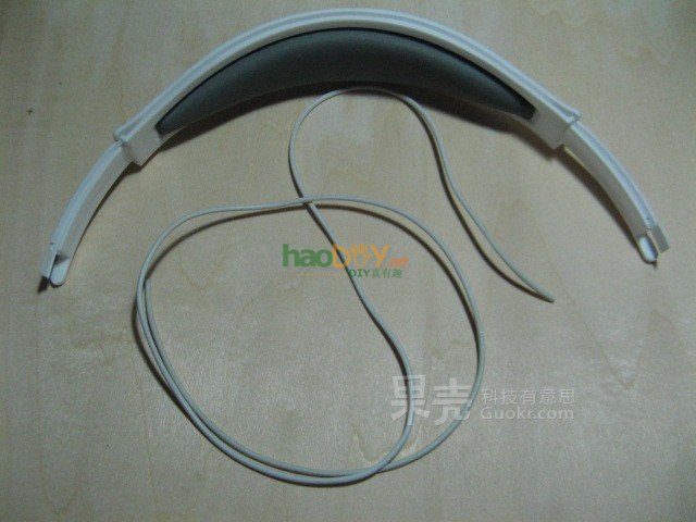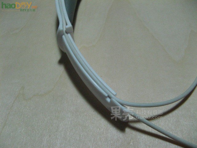 如图所示,将耳机线压进头罩时突然发现这款耳机貌似是有设计过线槽的,耳机线可以很轻松的压进去,就连伸缩和折叠转轴部分都有过线槽,大大方便了本次制作…… 再卡一根线进去,如图所示,一根是电源线一根是左声道音频线。