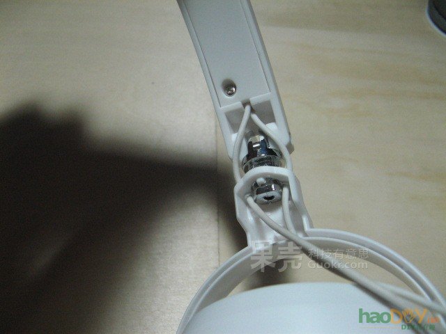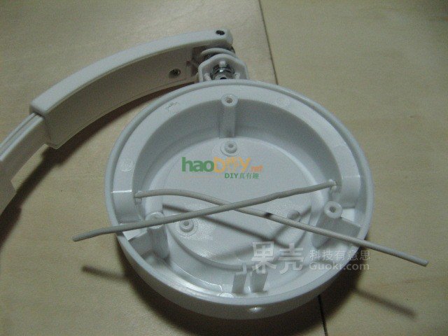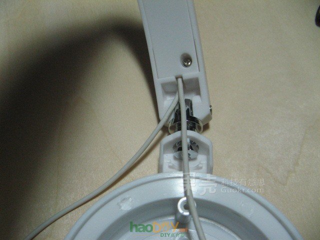 至于侧面的转轴部分,先将转轴拆出来,然后将耳机线穿进去,最后再把转轴装回去。