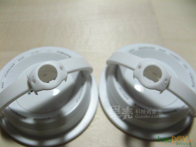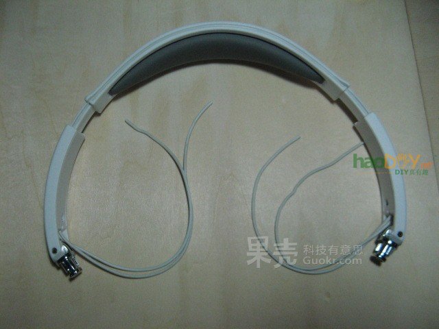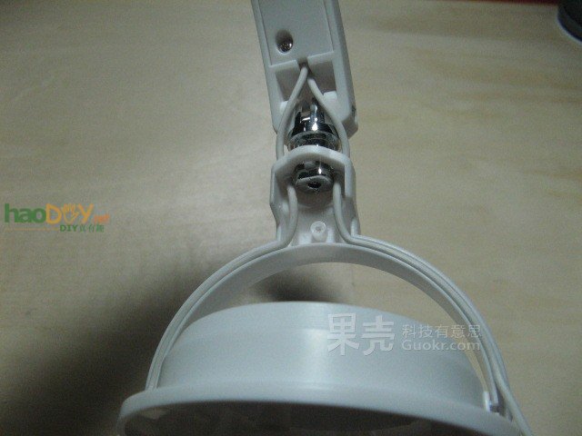 将耳罩部分装上,但是发现图中金属的转轴部分原先设计的走线槽只能容纳一根线,无法穿过两根线,这时候只有直接在听筒的外壳上打孔过线了……