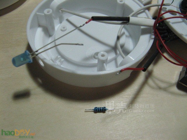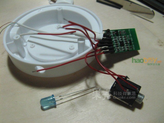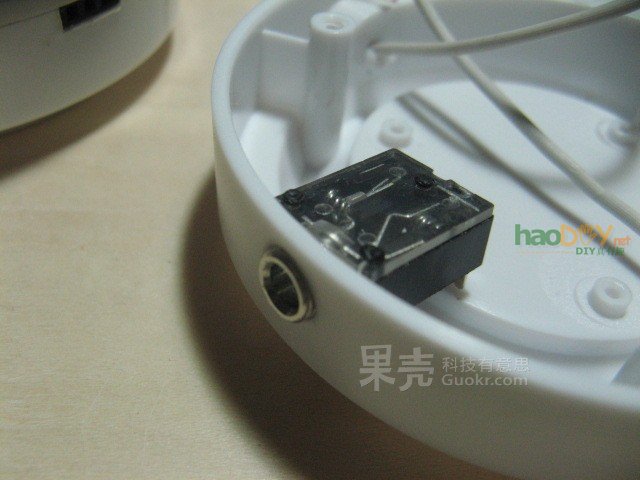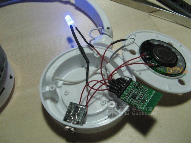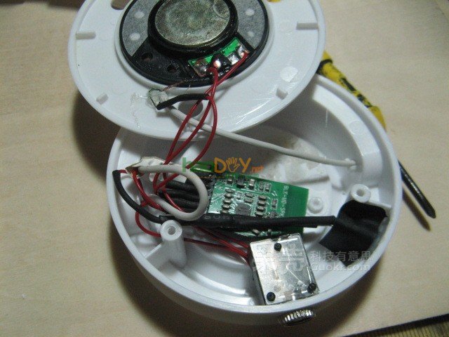 将从左边穿过来的右声道音频线接好,然后打开电源开关测试,蓝灯快闪,正常进入被搜索状态!