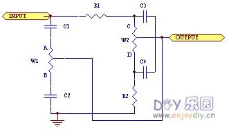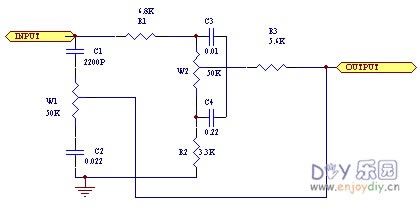 以下是一个实际的电路图,其中R1=6.8K、R2=3.3K、R3=5.6K、C1=2200P、C2=0.022、C3=0.01、C4=0.22、W1=W2=50K,R3是一个隔离电阻。