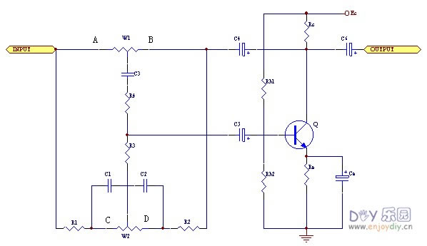高音、低音分开调节:C1、C2、W1构成高音调节器,R1、R2、C3、C4、W2构成低音调节器。W1旋到A点时高音提升,旋到B点时高音衰减。W2旋到C点时低音提升,旋到D点时低音衰减。组成音调电路的元件值必须满足下列关系: