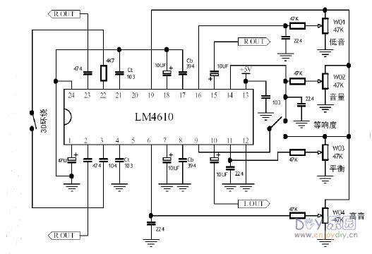 LM4610是美国NS公司继LM1036后推出的又一款HI-FI级前置,是LM1036的理想替代产品,它也是利用直流电压来调节两个声道音量,高音,低音,平衡。该IC还在LM1036的基础上增加3D声场展宽调节,它还带有一个等响度开关,用以补偿在小音量时的人耳特性曲线。