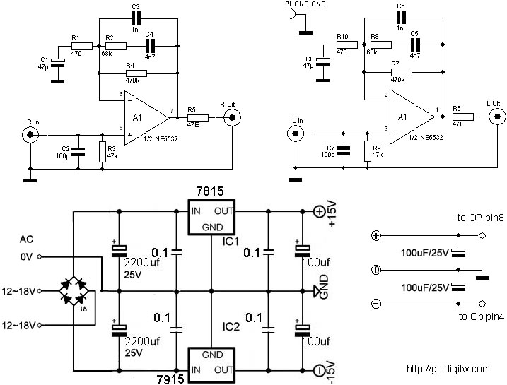 雖然目前的音樂格式大都以數位音訊為主流,但還是有許多人喜歡以往類比的黑膠唱盤所播放的音色,或是家中又翻出了早年的LP唱片! 現在這樣的復古風潮讓LP又有了特定的喜愛族群。 最近因朋友的請託, 要我讓他可以把家的LP唱盤再拿來使用,所以為製作了一個簡單的MC(動圈式)唱頭放大器,從網路上找到一個簡單的電路, 再加上一個簡單的雙電源穩壓電路,結合成一個DIY的 LP MC 唱頭放大器,如下圖: ![]() 電路非常的簡單,但由於唱頭輸出的電壓峰值很低,所以這樣的放大器的放大位率都會很高,所以雜訊的處理就要非常的小心了,所以我在LAYOUT上做了一些屏蔽的處理,以下就是LAYOUT及零件的配置圖: ![]() #要觀看大圖請對圖按右鍵另存新檔 電路板底片圖下載:MC-RIAA-BL.pdf