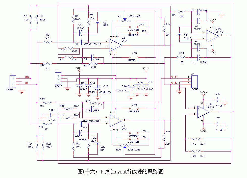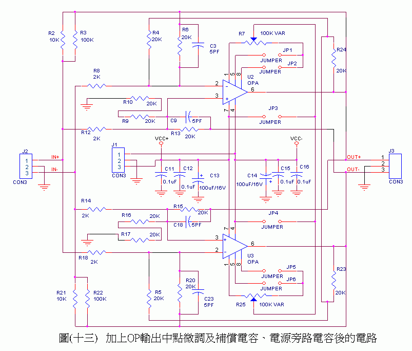這個圖是加上 OP輸出中點微調及頻率補償電容、電源旁路電容後的樣子。