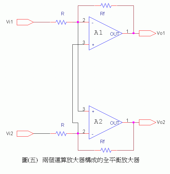 圖(五)中的兩個運算放大器如果共用差動輸入級其實就等於圖(一)的電路。對於運算