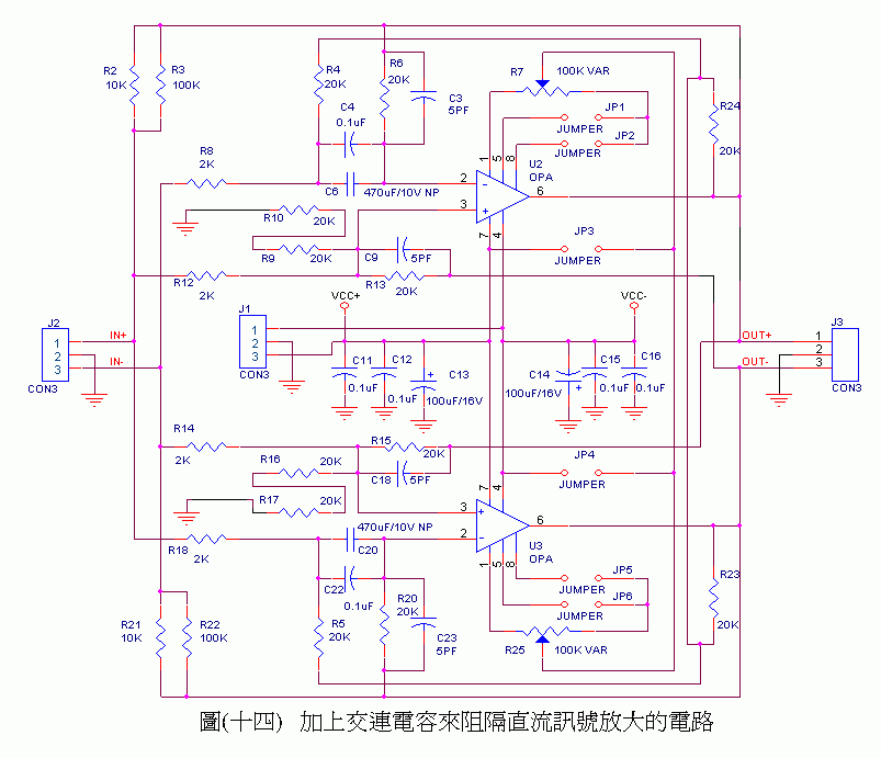 因此這個PC板不論是要裝成圖(十三)的直流放大器、圖(十四)的交流放大器,或是圖