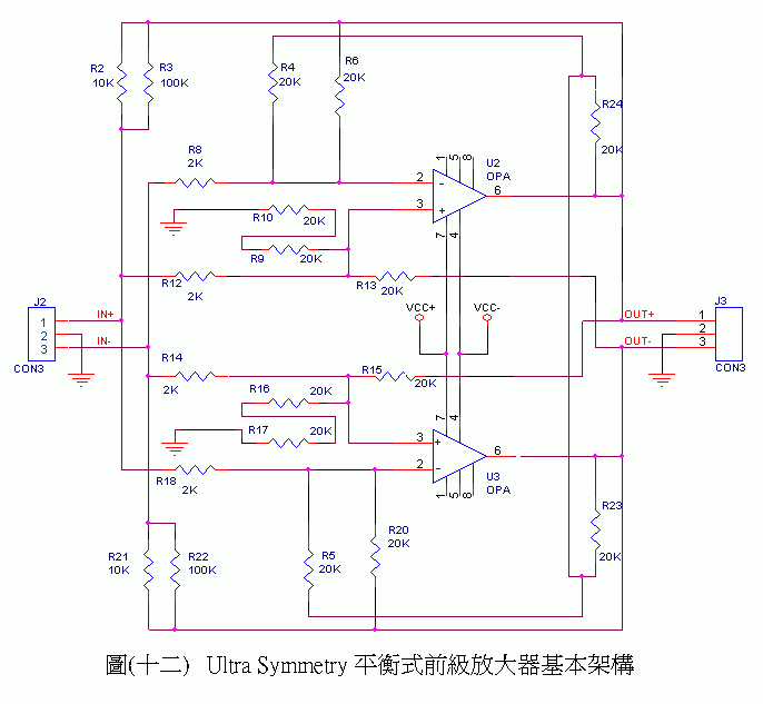 圖(十一)的電路平衡輸入時的輸入阻抗為 Ri/2,那麼圖(十二)的電路中,Ri為 2k,輸