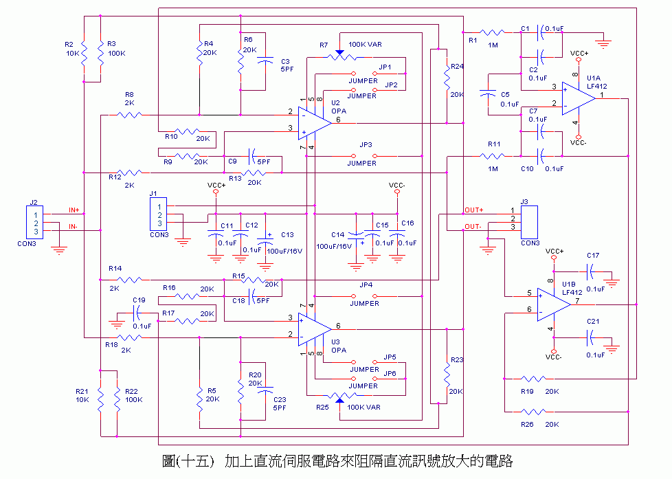 這個圖是加上直流伺服電路來阻隔直流訊號放大的電路。