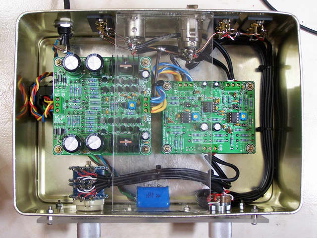 餅乾盒內部的佈局如上面的照片所示。右邊是兩塊 Ultra Symmetry 平衡式前級放
