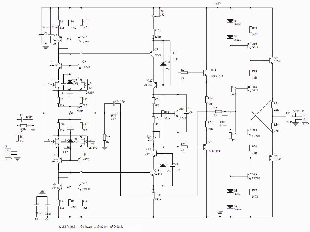 R9,R19,R31,决定下一级静态工作点,实际对本级工作点也有影响,R9是调节中点电位设的,跟据R31的大小来决定,R31取值在330R~680R,我没什么经验,取430R,R9取1K可调电阻,R19取200R,起到一个保护作用.不能不用.