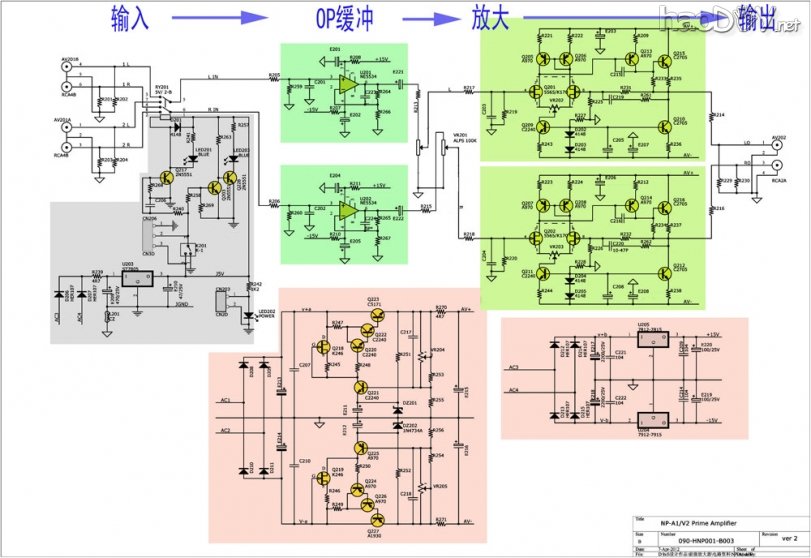 2、OP缓冲:增益为1。本级为单独一组供电,采用三端稳压管7815和7915后得到±15V。