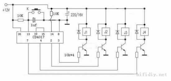 前段时间看论坛上一位大侠发了个4017做的单按键5路音源切换电路,嘿嘿!正好能用到,后来学习了这个ic的基本参数,小改了一下成4路的如下