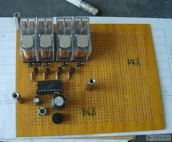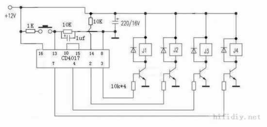 功放需要接好几路信号,有电脑、机顶盒、一个FM收音板还有一个测试用的。。。。整天拔来拔去的,烦的慌 前段时间看论坛上一位大侠发了个4017做的单按键5路音源切换电路,嘿嘿!正好能用到,后来学习了这个ic的基本参数,小改了一下成4路的如下 试验上图发现只