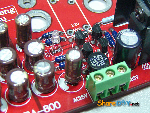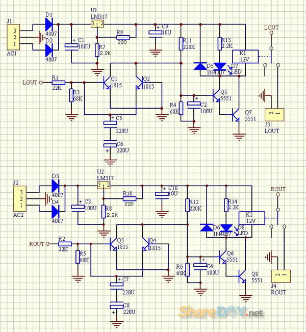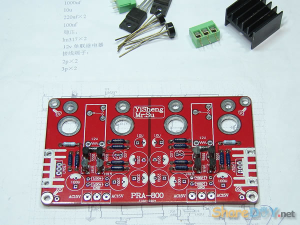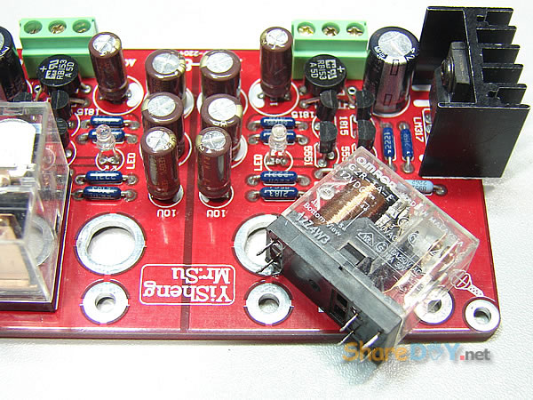 顾名思义就是保护喇叭用,接在功放输出端保护音箱用,即在功放与喇叭输出之间串入继电器,在功放开机时避免电流冲击喇叭,或者在功放输出直流时断开喇叭,起到保护喇叭作用! 线路原理图: ![]() PCB: 双面高级玻璃纤维PCB,2.0MM厚,大电流布线,每声道电源和地完全独立,避免了共地产生的交流声,供电采用LM317高精度稳压IC,并安装散热器,工作更可靠!本品还有一个最大的特点:可以直接安装到机箱的喇叭接线柱上,无需螺丝固定!喇叭接线柱安装孔距离:30MM 1.准备材料和工具 打印电路图和元件清单 DALE军规金属膜 1/4W 电阻 ELNA电解电容 台产优质 3位接线端子 1N4007二极管 欧姆龙继电器 2只 LM317稳压块 2只 ![]() 2.装配过程 安装顺序时先安装小部件零件,首先安装电阻,采用HI-END名厂常用的1/4W、1/2W、2W的DALE军规电阻不但兼顾美观,而且音质优异、坚固耐用。把电阻折成90度直角,便于安装,而且美观,安装电阻时,养成把阻值字体的一面朝上,便于以后安装调试、维修 ![]() 电阻安装完成,继续安装其它部件,安装顺序为先安装小部件,然后再安装大的部件。 ![]() 线路图、pcb板设计为双交流电供电,因为本人的变压器为单电压,根据情况改为单电压供电,即双交流电压:*V-0V-*V ,改为单交流电压0V-*V 供电,只需改动整流方式就可 改动前(双交流电压:*V-0V-*V ) ![]() 改动后(单交流电压0V-*V) ![]() 安装整流桥 ![]() 主体安装完成 ![]() ![]() 安装欧姆龙继电器,两个声道为独立控制 ![]() 安装完成 ![]() 检查无误后,即可装入功放中。 (责任编辑:admin) |