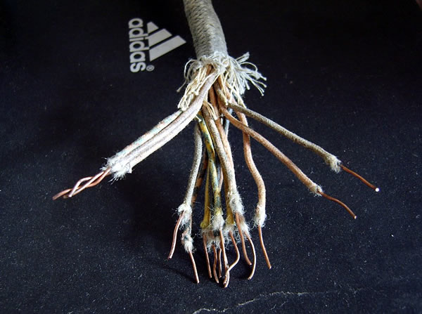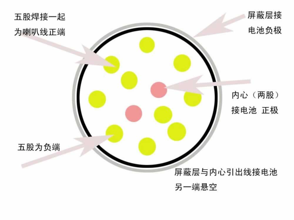 12股的西电线 ,每一股都是绝缘的。5股接在一起为正端,另5股接一起为负端。剩下两股接在一起,引出一条线接电池正极同其他线绝缘,西电线外部套入绝缘网引出一条线接电池负极,与其他线绝缘。