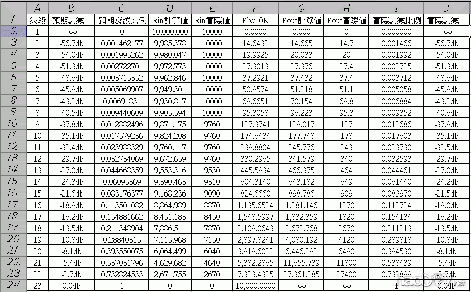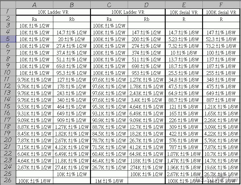 下表為梯子型Ladder Type和串列型Serial Type級進音量電位器電阻值列表,因為