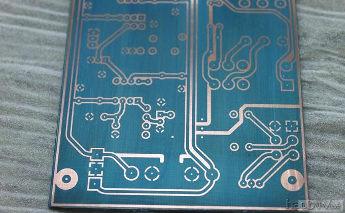 虽然可以用加大曝光时间来弥补,但A4纸透光率不足的问题没有得到根本解决,应该有办法。还是用食用油,这次直接把油刷到感光板上,油可以刷厚一点,把A4纸贴上去,就像手机贴膜一样,来回压几下,可以清楚的看到蓝色的感光板了,这下OK了。开始曝光,时间10分钟。自干型感光油墨不像干膜,曝光后看不到电路图的。接下来显影、腐蚀、脱膜就不多说了。看看效果,应该可以不去买那些贵的胶片了。。呵呵