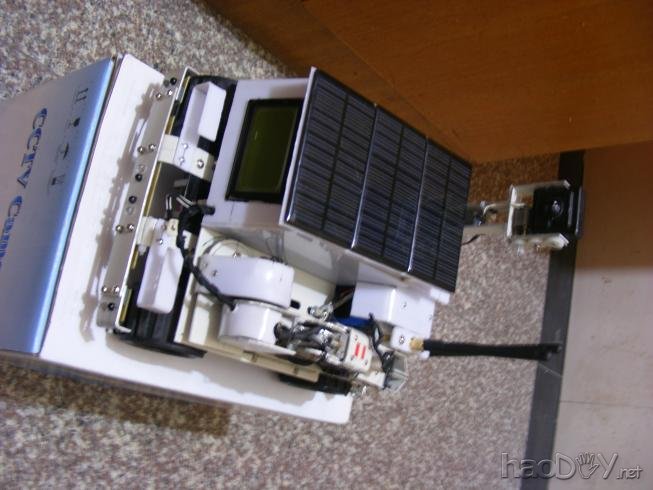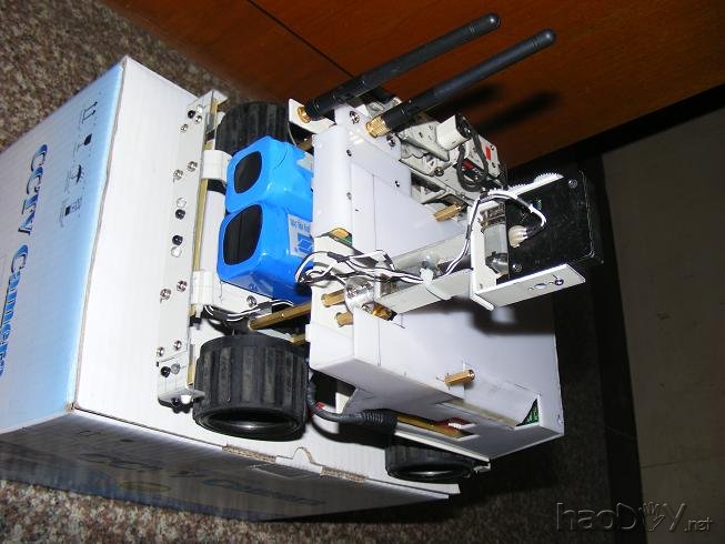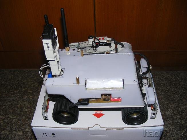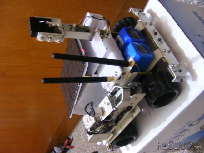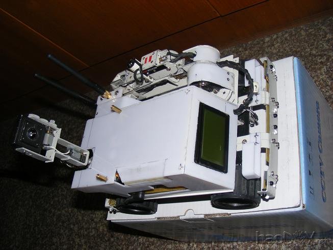 最近花了将近3个月的时间做了一个四轮驱动机器人,感觉还不错,所以出来晒晒图,与大家分享。已将图片压缩。 这个四轮驱动机器人的底盘完全由手工打造,无论是轮子还是底盘,大家可以看看图哦 轮子是由一个铝合金外罩,内部嵌入钢轮,再连接减速电机,轮子的外面很清晰的可以看是有橡胶用502粘起来,效果不错哦。 下面介绍一下机器人的功能: 这是一个无线远程端控制型四轮驱动机器人,带有水平垂直控制云台,云台上搭载一个豆干摄像头,3.6MM镜头,可以看到较广的视野。3度机械手,可以实现较难度的控制, 搭载一个12864控制显示液晶模块。 外加一个无线网卡实现无线控制。实现寻迹、前后四方向自动壁障,太阳能充电,16.5V电池管理和编程自动化等功能。 虽然自动寻迹,自动壁障,太阳能充电,还没做,不过都是简单的几个功能。 下面详细介绍各部分 我喜欢而且最费时间的是底盘部分,毕竟基础一定要打好,不然会翻车哦,底盘很重,完全有金属打造,轮子外圈采用中空铝合金,由于里面是中空的,所以得装中心轴,而中心轴采用经过打磨的纯钢圈,再里面是铜轴与减速电机连接,所以较复杂也费时间。底盘面也采用钢板构架。与电机固定的是铁支架,所以整套底盘完完全全由钢铁制作。减速电机的速度为30圈每分钟。速度不是很快,但很精确。 机械手的结构足足花了我半个月的时间,其主要材料采用铝合金,因为铝合金的材质很轻,且质量较硬。所以做机械手是最合适的,上面的每一个结构和关节都由手工打磨而成。花费了不少时间和精力,毕竟要在图纸上设计机械手的结构和相关参数。而机械手的动力也采用减速电机来做,而不用舵机。舵机打算在改进后设计。这只机械手有3个垂直水平关节结构和一个夹手。里面都设计了一个方向接触式传感器,可控制机械手的伸缩角度。摄像头云台也采用减速电机设计,外铝合金构架。 上面搭载的摄像头为480线的模拟豆干。再经过齿轮的减速可以将摄像头转动速度降低。提高图像稳定性。无线网卡为了防干扰再外面加了个铁罩。外面引了一个外置天线,一般无线传输距离室内100米左右。 控制显示采用的是12864液晶模块,这种模块使用很是方便,也效果也好,亮度,灰度可调,可显示16*16的字体,也可以显示黑白图片。不带字库。 接下来也是最重要的电路部分了,由于我把它们装在了一起,拆下来很麻烦,所以就整体拍了,电路板最下面一层是我自己做的电路板,采用双层覆铜板,用激光打印机进行热转印腐蚀出来的,主要的单片机采用AT89S52这种常用且低廉的单片机。8K容量。虽然如果搞全自动智能控制可能空间不够,但简单的也足以,再改进型中将会使用STM32,大大加强功能。次电路板包含IO口的扩展,电源部分,16双路电机驱动部分,可以控制16个电机。串口输入输出接口,12864液晶功能。485电路,外部315遥控器电路。外部16路传感器输入端,可以检测16个传感器,红外,超声波等。外加3路独立的控制I0。可以控制探照灯的开和关。等等其他。上面两块为网络模块,通过此模块与无线网卡的链接与无线路由器链接,无线路由器再链接到笔记本电脑上,实现笔记本远程端控制机器人功能,电脑发送的指令经过电脑的无线网卡发给路由器,再由路由器发给机器人的无线网卡接收,网卡接收后有网络模块解码成232串口信号,在通过芯片转485给控制模块,控制模块将485通过电平转换芯片变成232给单片机,通过单片机解码成相应的控制指令。而机器人的视频信号通过无线网络模块传给路由再给电脑的远程视频控制软件接收。当把远程视频客户端中的对讲打开后可以监听机器人通过麦克风捕捉到的音频信号,实现远程监听功能。 机器人的电力系统采用两个16.5V,3A的锂电池供电,续航能力高达7个小时,连续航7小时,当你不控制的时候可以通过客户端控制进入省电模式,关闭相关功能,比如摄像头,探照灯等。当没电的时候可以通过寻迹功能自动行驶到充电的地方自动充电。 12864液晶显示模块会显示机器人相关的信息,包括电池监控,机械手状况,前方是否有障碍等等。 扩展可以在电路板上面加装太阳能电池,以增强机器人的续航能力。 如果将机器人接入外网,也就是广域网访问局域网的话,可以实现在任何一个有网络的地方来控制机器人,很是方便。 此机器人完全可以用在很多方面 比如排爆,消防,拣危险物品,通道检查,家庭监视,等等甚至登月。 好了,废话不说,大家看图片吧,由于是快做完了才拍照,有些制作过程中的情节未能上图,接下来还会有所改进,感谢大家的支持和期待。 谢谢继续关注我的DIY四轮驱动机器人的朋友们。 由于最近工作繁忙,导致四轮驱动机器人的改造工作缓慢。 这个礼拜终于花了点时间做了几样东西,包括四轮机器人的前后保险杠。两个3路的红外传感器电路。顺便把我的主控板,IP模块,电源板等晒晒! 看图哈 ![]() 机器人主控板正面图,正面包含3.3V,5A电源芯片,5V,1.5A电源部分,315遥控接收电路,12路3.3V电机驱动接口,4路16.5V电机驱动接口,1个74HC154地址扩展芯片,12864液晶显示接口,24路外部检测接口,232串口接口等 ![]() 机器人主控板背面图,背面集合了6个BD6735,3.3V电机驱动芯片。2个BD6208,16.5V的电机驱动芯片,9个245单片机IO扩展芯片,1个AT89S52单片机,232芯片等。 ![]() ![]() PCB 3路的红外传感器电路板,采用LM324做比较并采样 接收距离可通过可调电