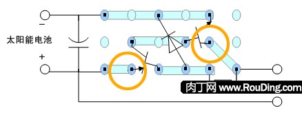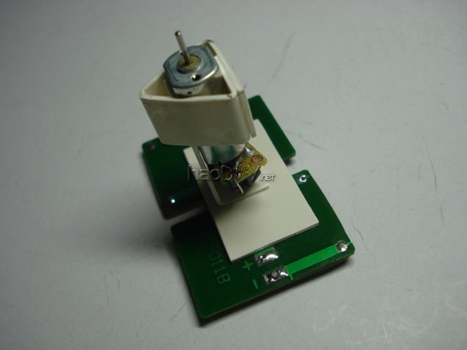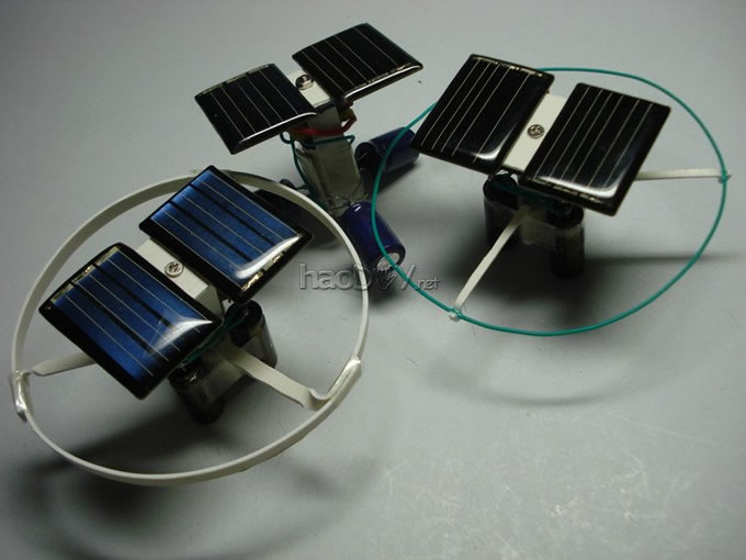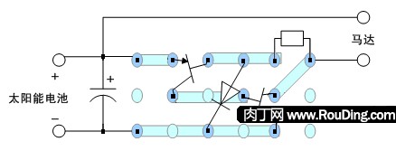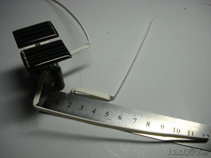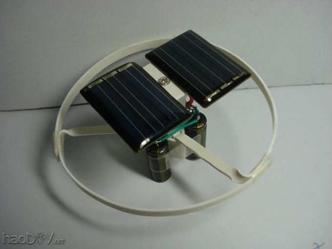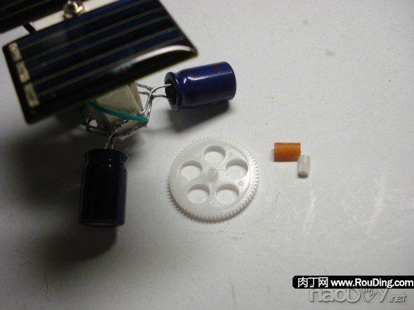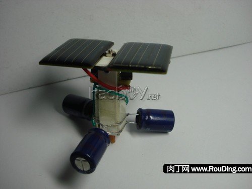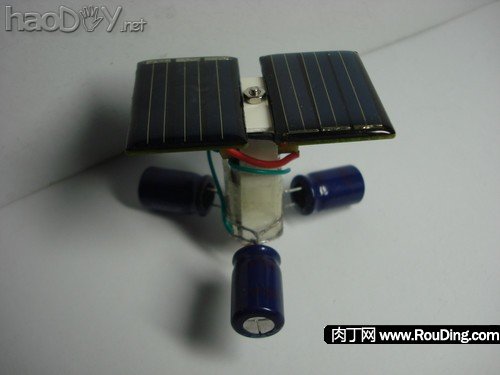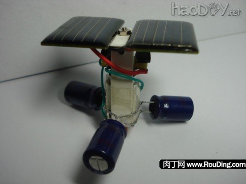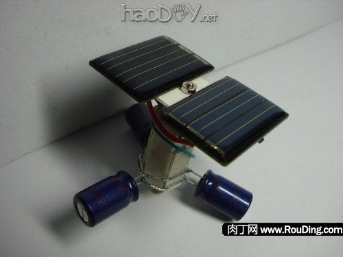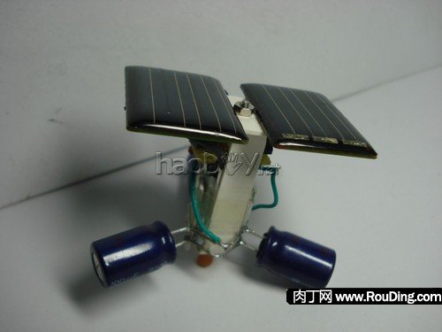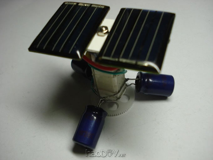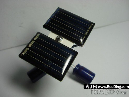 把太阳能电池板用双面胶布牢靠在支架上,凭证电路道理图把电解电容以及太阳能电池板的电极用电线与电路板毗连起来。同时把小齿轮安装到电机上,而且在小齿轮上套上一截自行车气门芯胶管(也可以省略)。