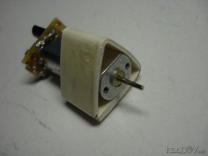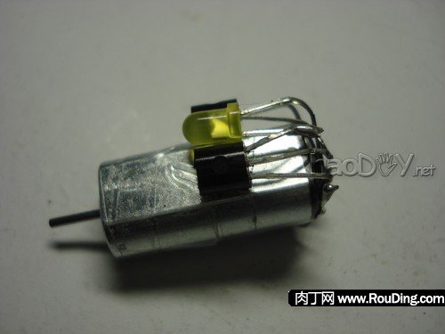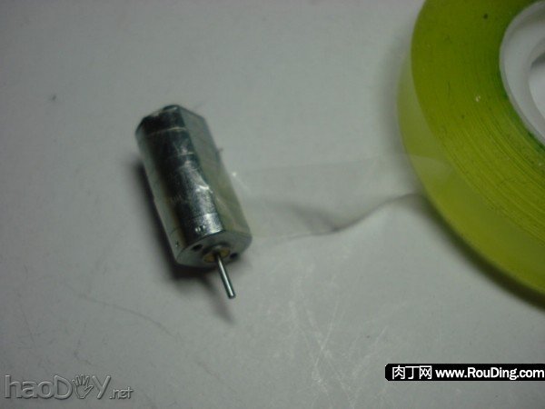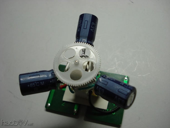 用透明胶布把三个电解电容如下图所示绑贴在电机支架周围做成支架,而且给电机装上小齿轮并在表面套一截自行车气门心胶管做成底部转盘(也可以只安装小齿轮不消气门芯胶管,运行结果会有差异)。留意电机轴突出要高过三个电解电容的底部,即让底部转盘要轻微高过三个电解电容做成的支架。