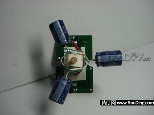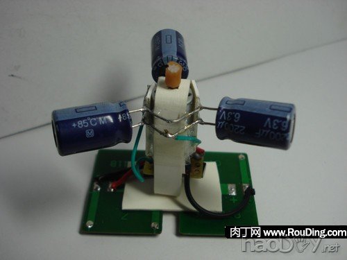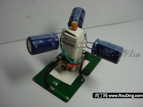 下面大略的先容一下制作进程。 原料筹备和第一个版本是相同的,电路板也是直接焊接在电机电极上的,不外三个电解电容可以选择外形上轻微细长的范例,且引脚不必要很长的那种。