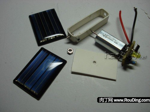 开始整机组装。 筹备好全部的待组装器件:太阳能电池板、太阳能电池板的支架、电机支架、电机以及电路板。