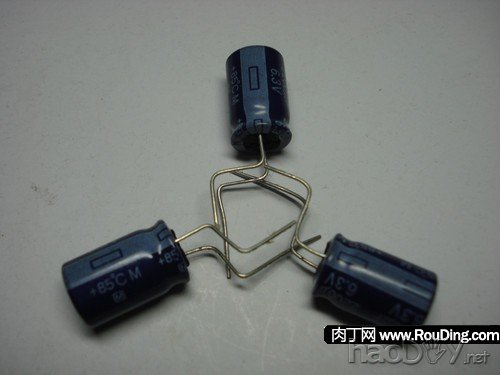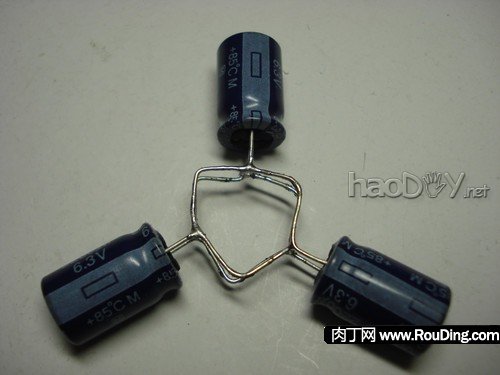 3.2、三脚支架 用三只电解电容做成三脚支架。 先把三只电解电容按下图机关排好。