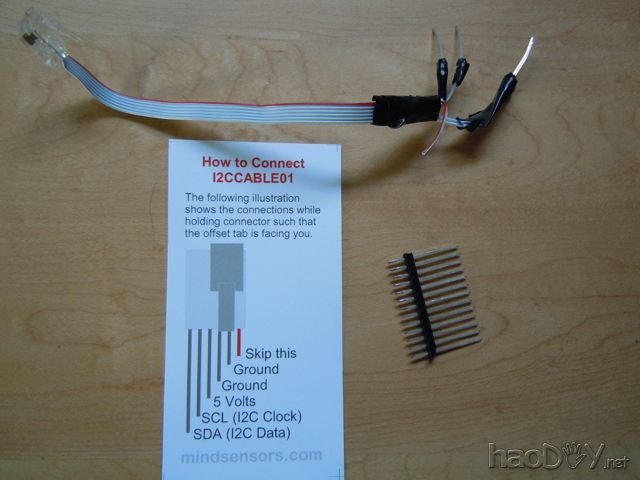 首先把I2C线切成两半,在这个制作中只需要半根线。 然后小心地把除红线以外的每条线剥离。 从排针上取出4根单独的针,分别焊接如下: 1根针接5V线 1#p#分页标题#e#根针接两个地线(将两个地线扭到一起) 1根针接SCL线 1根针接SDA线 用胶带把焊接的节点绝缘开来。