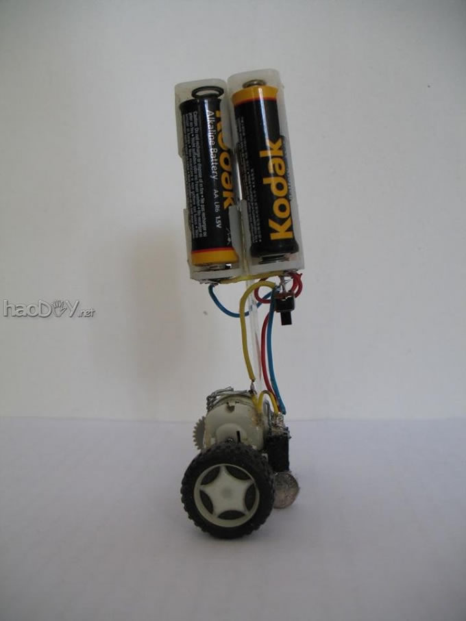 将钉子头用火烧热,安装在马达上的塑料板上,其位置要确保当机器人直立时,纽扣电池要碰到地面。