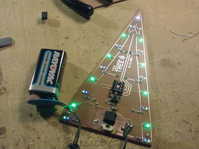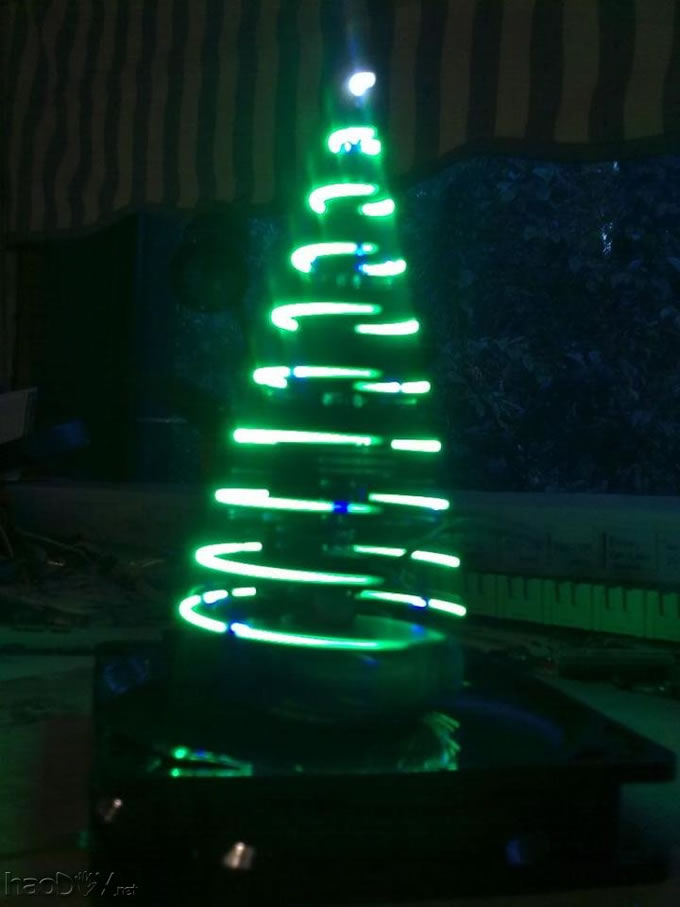 最后把装置接上电源,慢慢的提高风扇的电压。如果听到噪声,则需要停下风扇,检查圣诞树的平衡情况,把圣诞树调整好。
