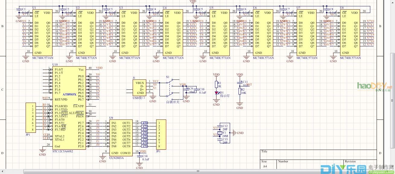 之前在网上看了一些光立方的演示视频,被它那些立体感吸引了。想到自己学单片机也这么久了,于是乎就想做一个玩玩,同时可以复习一学期以来自己的编程能力和动手的能力,一举两得是一件很不错的事情。向朋友要了一些资料,就开工了。 关键字:光立方 74HC573 STC12C5A60S2 ULN2803 电路原理图: ![]()