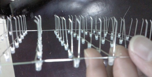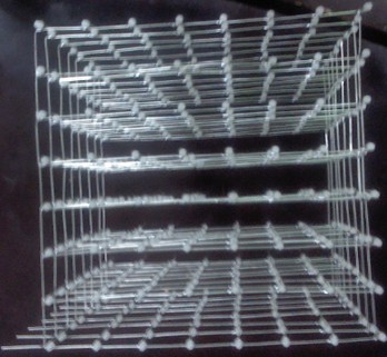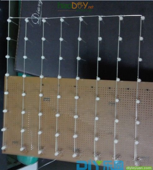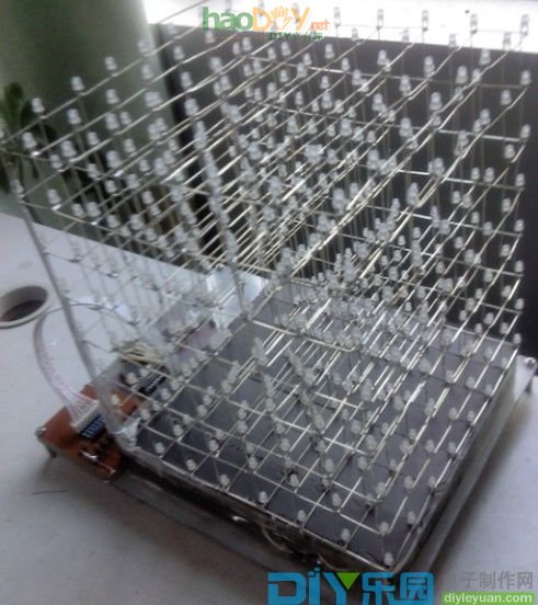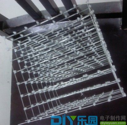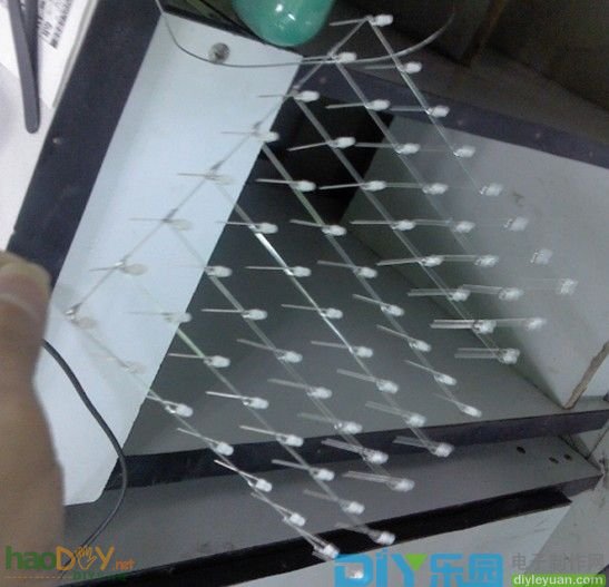 将每一层的正极的末端2mm左右向内弯曲45°左右如上图。留下最后一层不要动,作为最底层。然后用尽你所有的招式把每一层对应的正极连起来。呵呵,也没有什么好的方法推荐。下面是焊好的光立方: