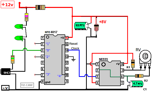 下面的电路的工作电压是12V ![]() ![]() 首先用CD4017设计一个驱动8个LED显示的电路。CD4017是一个最常用的计数器电路,我们通过CD4011产生时钟脉冲,同时您也可以使用其他类似的NE555甚至晶体管产生时钟脉冲。这些IC必须要特别小心,因为它们可能会被我们的手和焊接设备(烙铁)静电损坏。