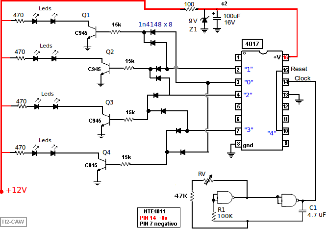 LED顺序显示电路(4017)这种电路可以制作引人注目或者用来指示装点物品,例如圣诞树,路标指示,景观灯等。