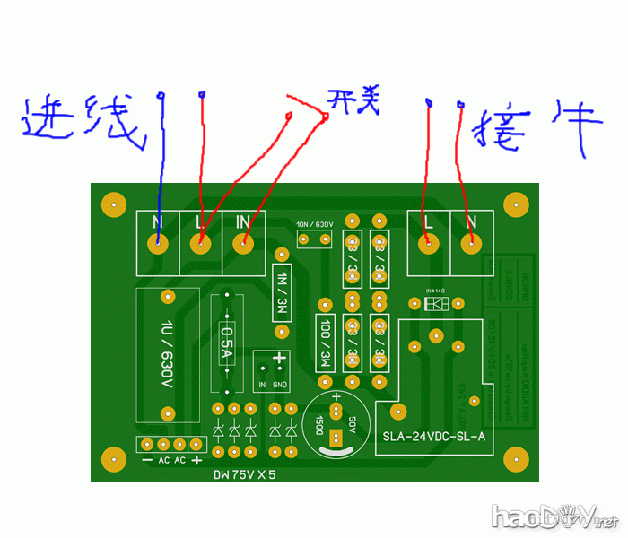 那个插座是供24V电源指示灯用的,如果电源指示灯不从这里引出的话电流就会过剩,这时可以把输入电容适当减少,或者用一只电阻并在继电器电源脚分走相应电流
