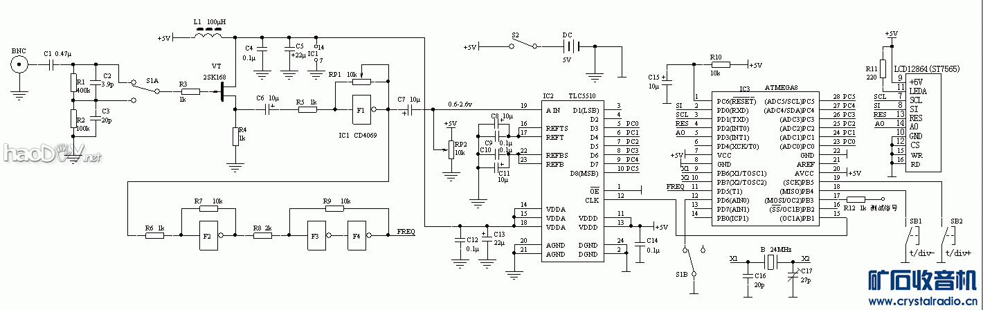 我只用了三块集成电路,其中CD4069的作用有两个:F1作线性放大用,其输入端接场效应管2SK168等组成的电压跟随器,输出信号供TLC5510作AD转换,为了简化电路和方便调试,这里采用了交流偶合方式;F2进一步对信号进行放大,放大的信号再由F3、F4等组成的施密特触发电路进行整形,整形后的脉冲供单片机ATmega8作频率计数用。