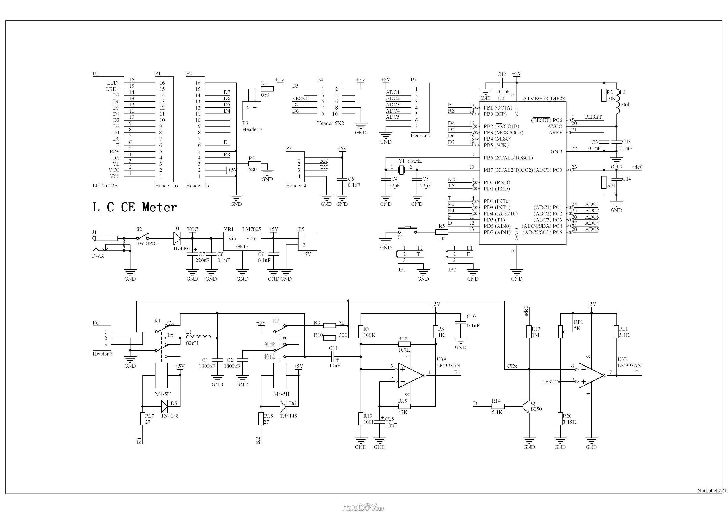 电路由比较器U3B,放电晶体管Q等组成。设定比较器正输入端为Uc,(Uc=0.632E=0.632⋅5=3.16V,调节RP1获得),反向输入端接被测电容CEx,当D端为高电平时,Q导通电路处于放电状态,这时CEx被放电,比较器U3B输出高电平。当D为低电平时Q截止电容CEx通过R9(R10)充电,CEx两端电压逐步升高,当CEx两端电压>Uc时,比较器U3B输出低电平,产生INT0中断(INT0中断设置为下降沿触发),中断服务程序读取定时器值,并计算、显示CEx的值。然后置位PD6为高电平,Q导通,CEx放电,延时100mS是为了保证CEx充分放电,中断返回开始下一个测量周期。为了提高测量精度电解电容测量分两档,由继电器K2切换,R9接入时测量0.1μF~500μF电容,R10接入时测量500μF~20000μF电容。R9(R10)的精度和电压Uc的精度基本上决定了测量结果精度。