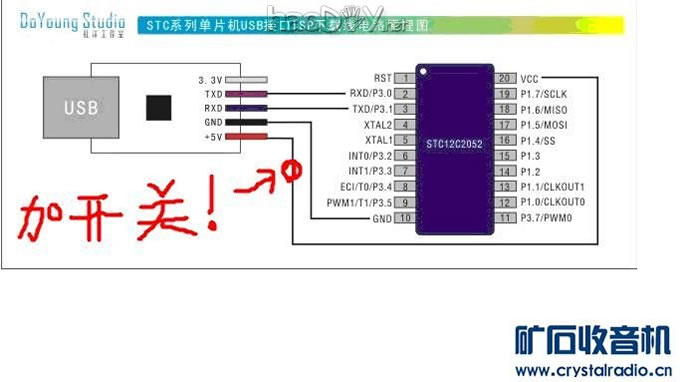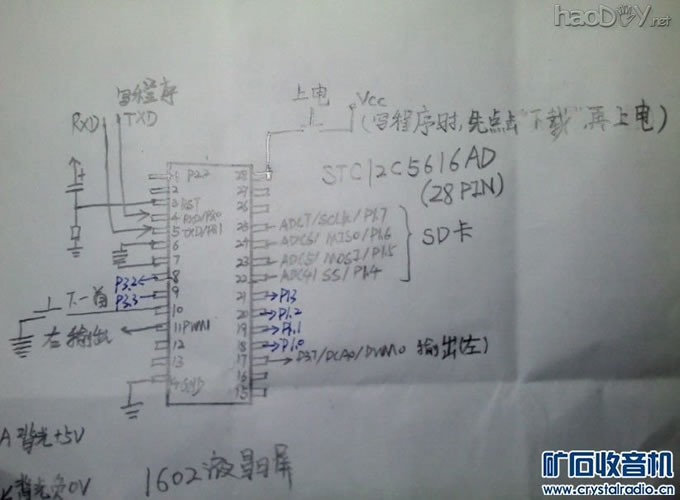献给单片机初学者WAV播放器=STC12C5616AD(28脚的)+SD/TF/MMC+1602(液晶显示) 本人玩单片机也就十天左右,原来一直在矿坛玩收音机,最近才对单片机上瘾。 首先感谢数码之家hitoo版主的非常的大无私帮助作用,由于本人为初学者,所以程序电路图均来自版主数码之家hitoo版主。自己只是在此基础上加以完善,校正了电路的不足之处,并增加了1602液晶显示,其余硬件均为自己原创。可以看出版主用的是20脚的12C5616AD,本人去电子市场转了半天只找到一家有28脚的,只好买回来试验。一查资料两个完全可以通用只是管脚定义不同。当然如果你要做的话,最好买20脚的。 首先借用hitoo版主原文的电路图,本人未作LM4871的功放电路,直接经电位器输出至耳机,音量刚好。本机支持最高取样率48KHz. 8bit.立体声/单声道的WAV歌曲,音质还不错,液晶屏可以显示“第几首歌,双声道/单声道,取样率等”(当然都是英文显示)。原程序在此 ![]() 首先来欣赏我的作品吧 http://v.youku.com/v_show/id_XMzE4MjI1ODY0.html 20脚的管脚说明 ![]() 28脚的管脚说明,已标出和20脚封装对应得脚(注意红字 ![]() 至此,由上面的可以看出两个单片机完全可以通用,电路图 ![]() 11.JPG (70.85 KB, 下载次数: 31)