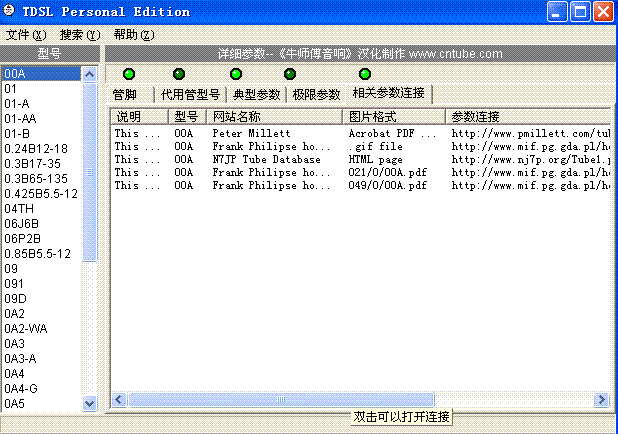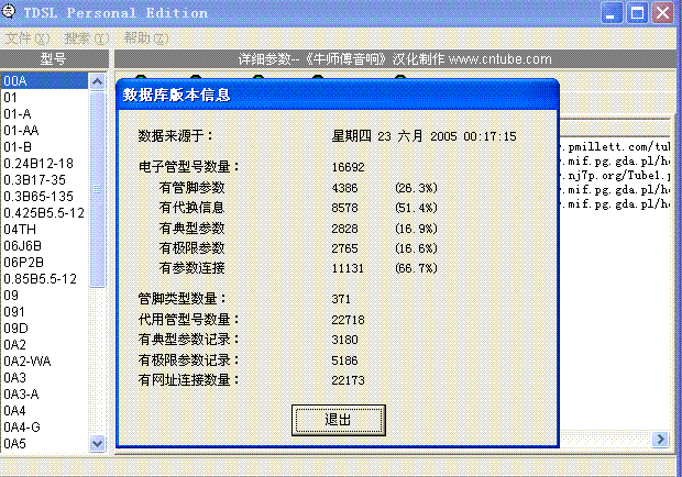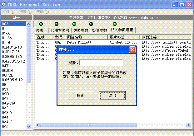 TDSL是由Duncan Amplification-http://www.duncanamps.com 网站发行,牛师傅汉化制作。这个软件非常实用,但可惜语言限制,在我们国内无法流行。牛师傅音响技术网站致力于音响技术的研究,为了众多音响发烧友能使用上这个软件,拿出部分精力来汉化了它。汉化过程中基本未改变原始版本信息,原本想把国产电子管全部添加上,暂时还是放弃了,等以后出自己的软件再说吧....汉化TDSL是我的处女作,加之时间仓促,难免出现一些错误,欢迎大家提出意见和建议。发烧友还需要什么样的软件汉化可以来信与我联系,我将尽量满足你的要求。![]() 对于国产电子管的查询,比如查6N系列国产管子,可以参考他型号后缀带“P”的型号,比如6N4,你可以点击6N4P,这是软件本身定义的苏联型号(其实前苏联的型号应该是6H4n),这样由于国产型号与前苏联型号基本相同,所查的参数基本可以通用。6P3P系列也一样可以查6P3、6P1、6p15等。国产整流管的查询也一样,比如查5Z3P,你可以输入5Z3查询。6z5P输入6Z5查询。 对于本软件使用中出现的问题欢迎大家提出,我可能最近修改一下一下原文件。 汉化的这个版本的电子管资料查询软件,最后更新于2005.6.23。本软件收集了电子管型号16692个,其中大部分有有关网页资料连接。有按型号搜索、按电子管参数搜索两种搜索方式,非常实用方便。 电子管参数查询软件是绿色软件,直接解压缩一个目录下即可使用,无需安装和卸载,软件本身也很小,只有1.82M。 ![]() ![]() 汉化版运行时会提示360病毒误报, 请关闭360安全卫士和360杀毒后再运行 或者下载英文版 |