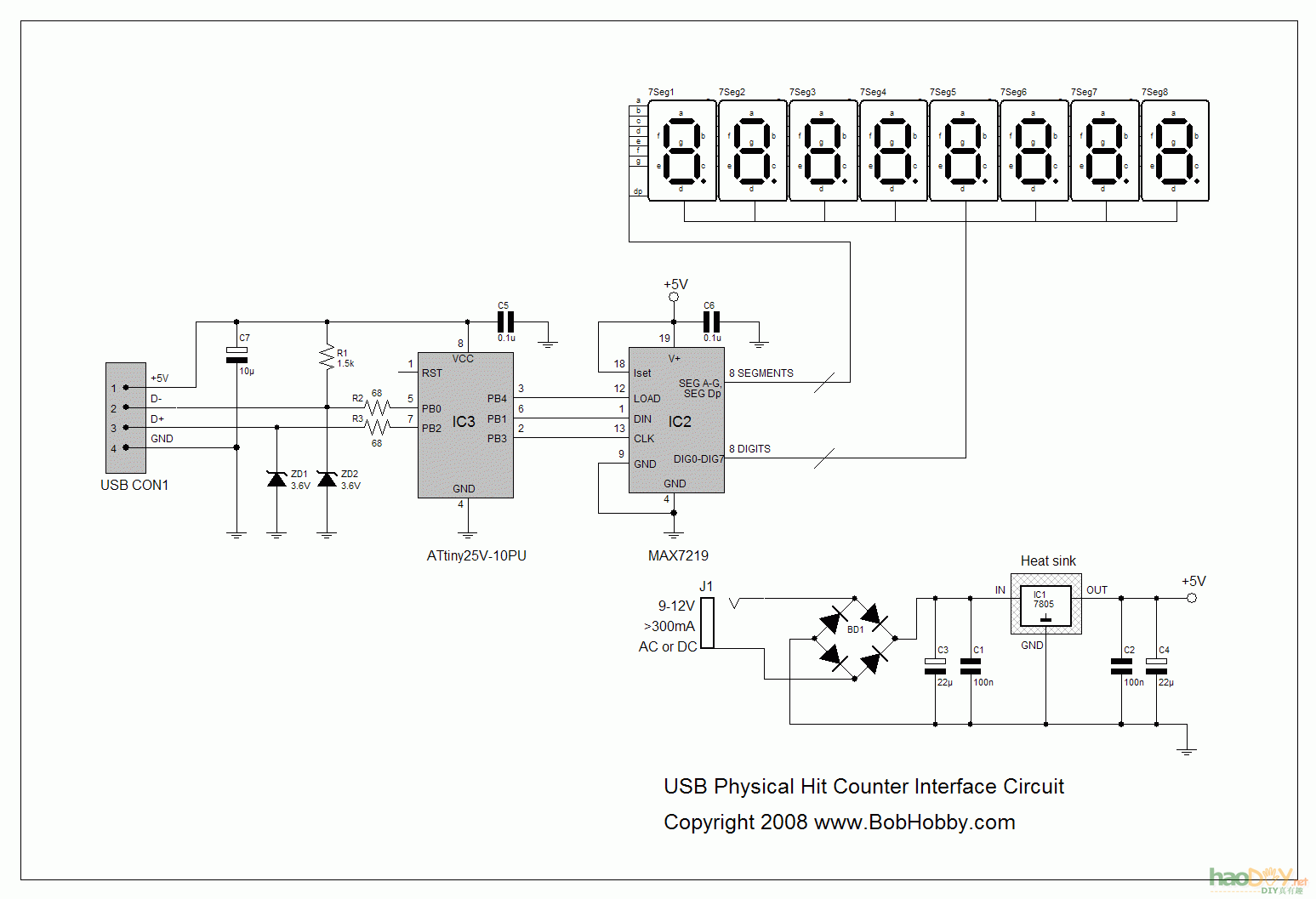 该计数器的核心是一个ATtiny25的单片机,它通过USB接口和PC机上运行的上位机程序通讯,获取到网站访问数,然后通过MAX7219驱动一个八位的数码管显示出来,真正看得到,摸得着。