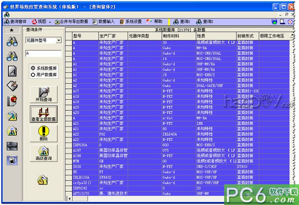 世界场效应管查询系统是针对广大电子爱好者(专业版)和从事电子产品制造的企业(企业版)又一款功能强大的查询软件,此软件最大限度的搜集了世界各国晶体管生产厂家的产品,其中囊括了200多个生产厂家近4万个场效应管的详细信息。